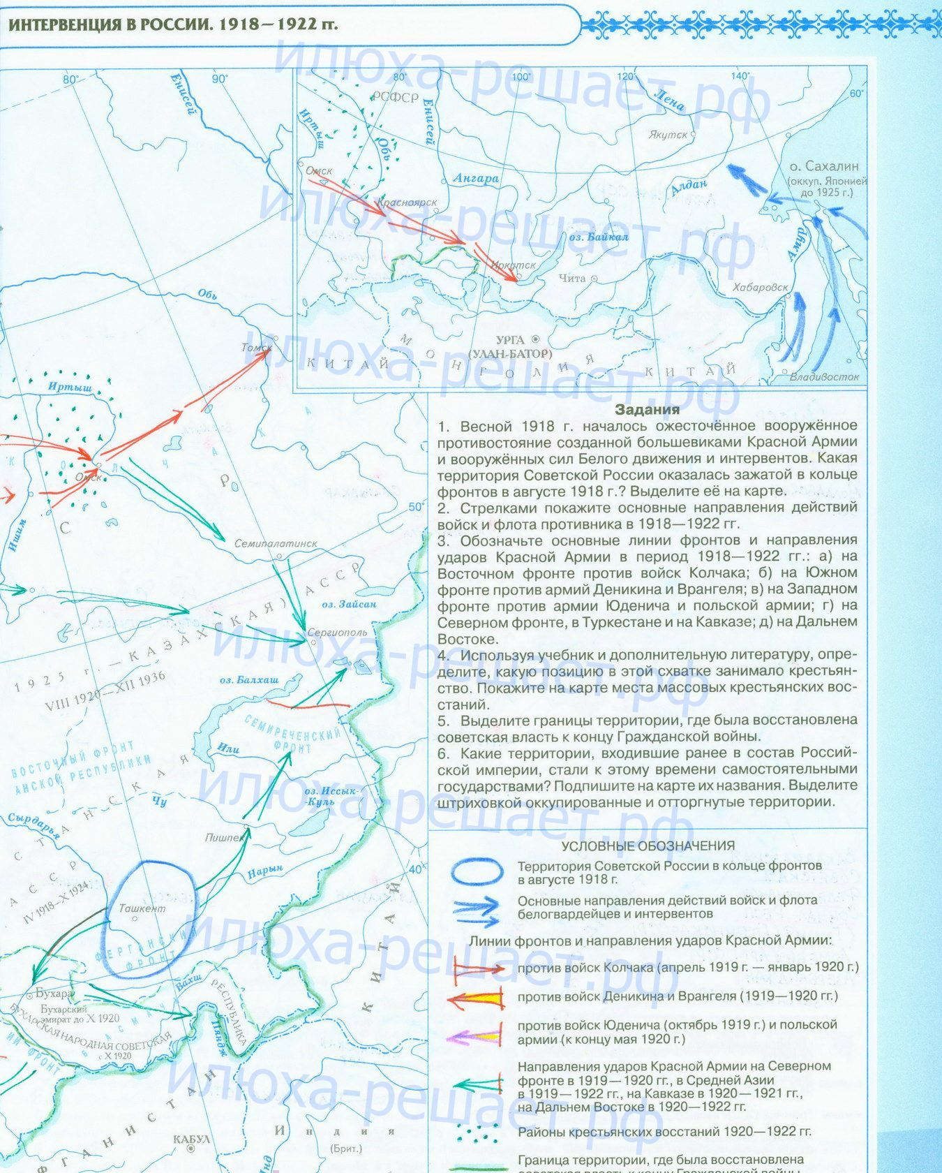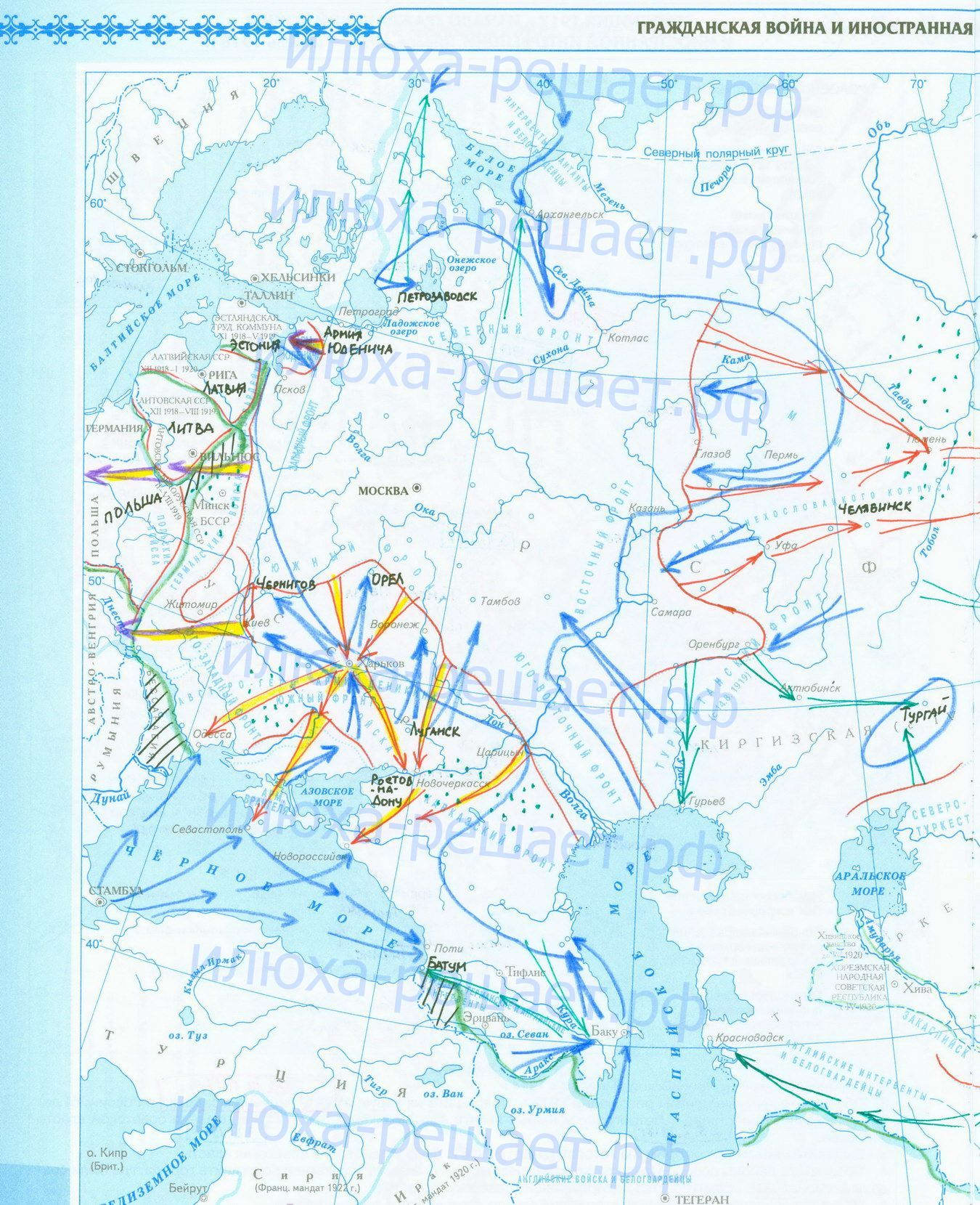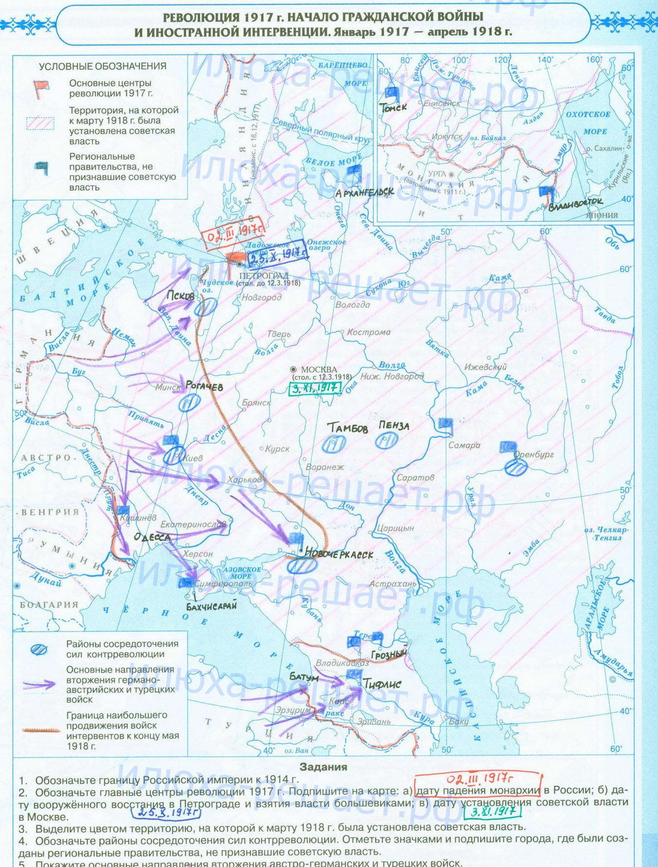 Революция 1917 года, начало Гражданской войны и иностранной интервенции; заполненная контурная карта с ответами стр 5