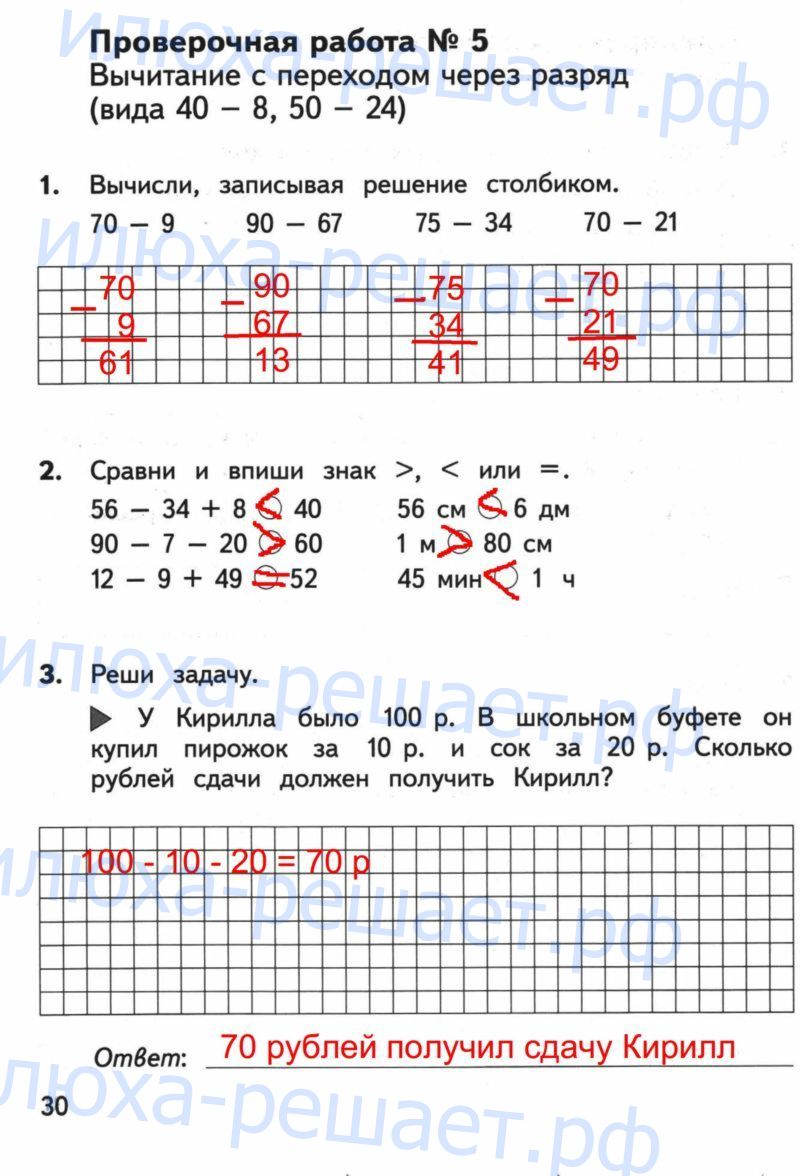 Проверочная работа № 5. Вычитание с переходом через разряд (вида 40 – 8, 50 – 24) 30