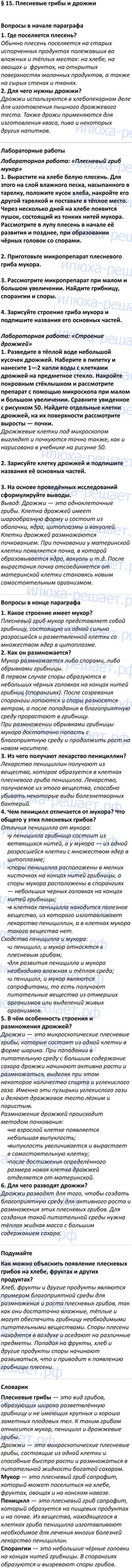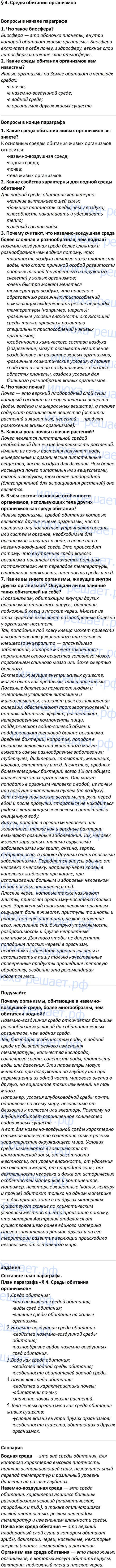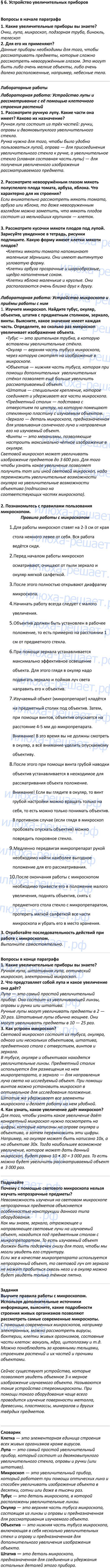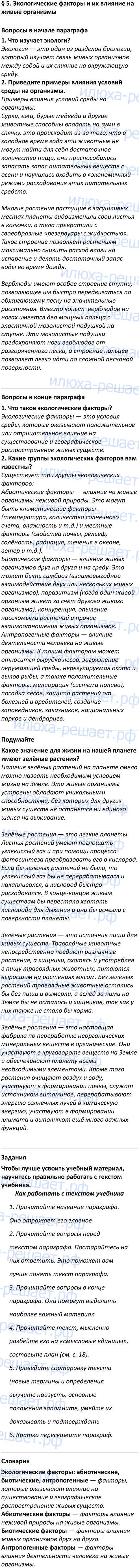 ГДЗ к учебнику по биологии 5 класс В.В. Пасечник ФГОС Дрофа является лучшим средством подготовки к уроку биологии. Решебник на своих страницах содержит ответы для подготовки и проверки домашнего задания: вопросы в конце и начале параграфа, подумайте, задания, определения, задания для любознательных, лабораторные работы.
